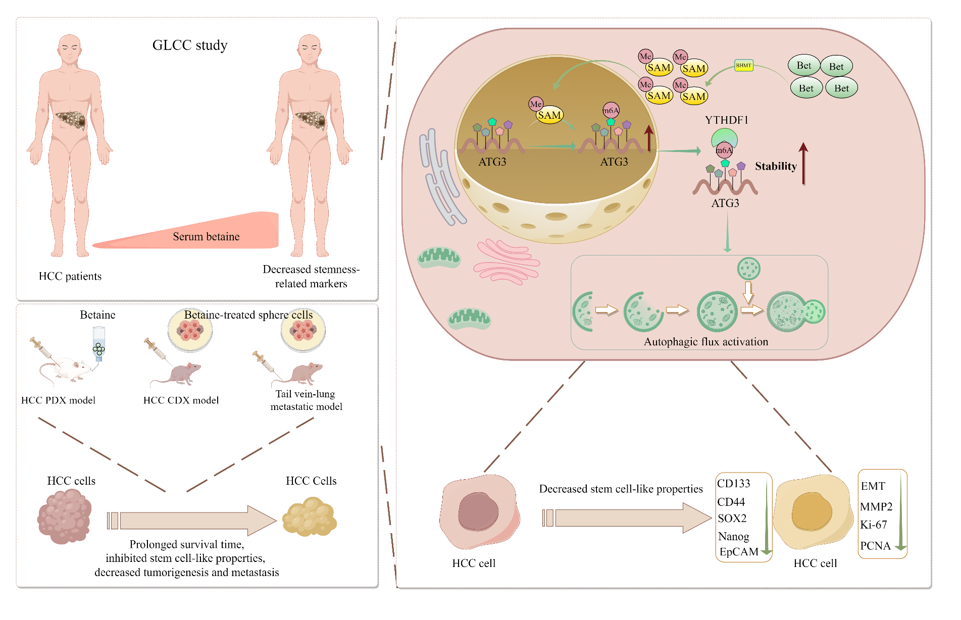 HCC是最常见的恶性肿瘤之一,具有较高的发病率和死亡率,中国每年HCC新发病例和死亡人数约占全球一半左右,造成了严重的社会经济负担。尽管近年来在HCC的诊断和治疗上已经取得了巨大的进步,但是HCC患者的预后仍然较差。造成HCC不良预后主要的原因是癌细胞复发和转移。研究发现,肿瘤干细胞样特性与肿瘤的复发和转移密切相关,抑制肿瘤干细胞样特性对改善肿瘤预后至关重要。甜菜碱是一种重要的甲基供体,广泛存在于甜菜、虾、菠菜和藜麦等食物中。在本课题组前期研究中发现,膳食甜菜碱摄入水平增加与原发性肝癌风险降低有关,并且甜菜碱饮水能缓解DEN诱导大鼠肝癌的进展,但是甜菜碱的抗肝癌机制仍不清楚。本研究通过构建人源HCC皮下移植瘤模型,发现甜菜碱通过激活自噬拮抗HCC干细胞样特性,抑制肿瘤生长和转移,延长肿瘤模型小鼠生存时间。机制上发现,甜菜碱在甜菜碱-同型半胱氨酸甲基转移酶(BHMT)作用下生成S-腺苷甲硫氨酸(SAM),SAM进一步升高自噬相关基因ATG3 mRNA的m⁶A甲基化修饰水平。接着,m⁶A “Reader”蛋白YTHDF1识别并结合到ATG3 mRNA的m⁶A修饰位点,升高其稳定性,进而促进ATG3表达来激活自噬,最终发挥抑制HCC干细胞样特性的作用。