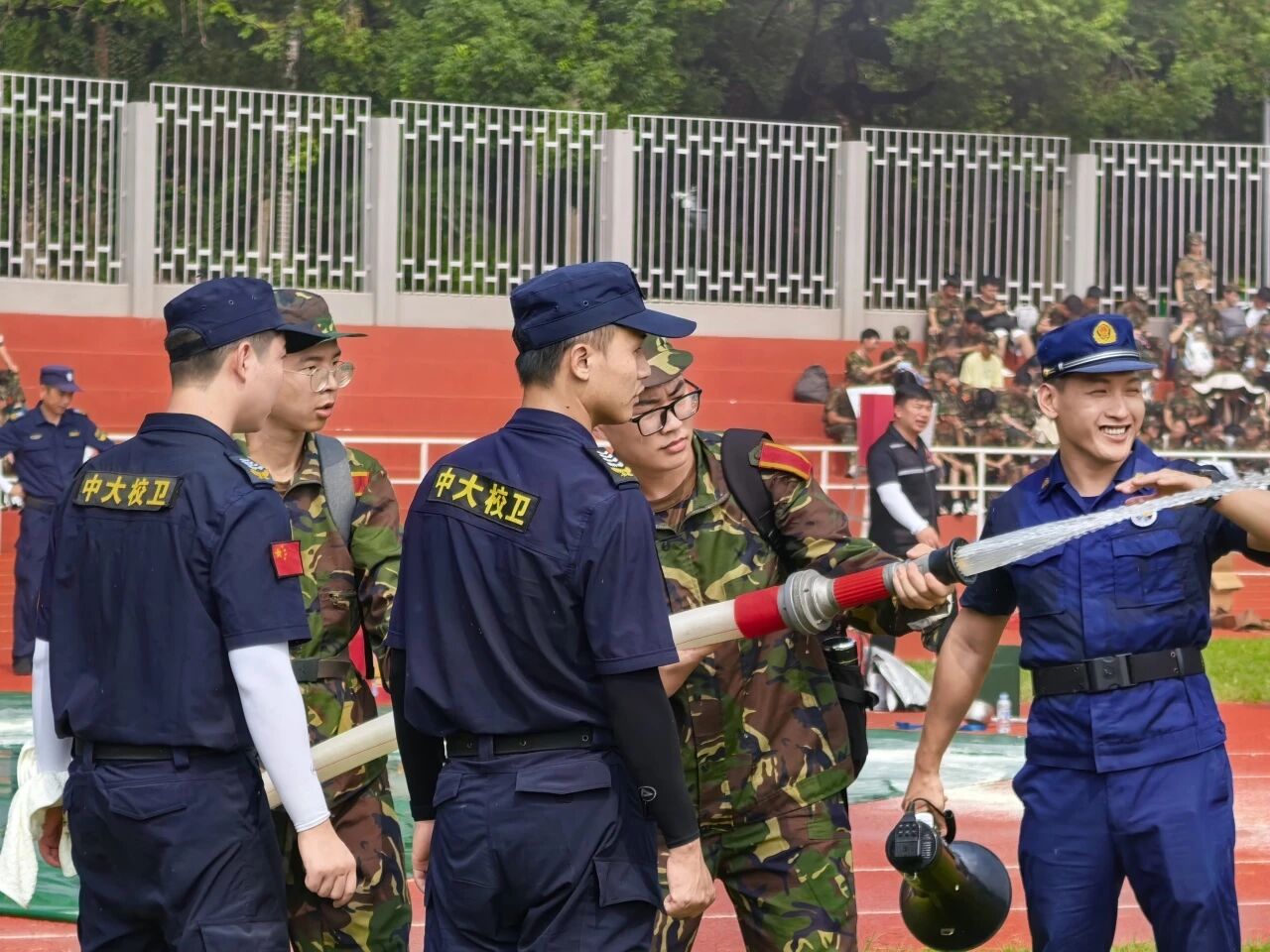 消防演练更添实战色彩。模拟浓烟帐篷中,大家低姿快速穿行;灭火环节中,“提、拔、握、压”四字口诀清晰响亮;水枪操作时,两人一组协同发力,水柱精准覆盖目标——他们不仅是学生,更是未来的“安全卫士”。