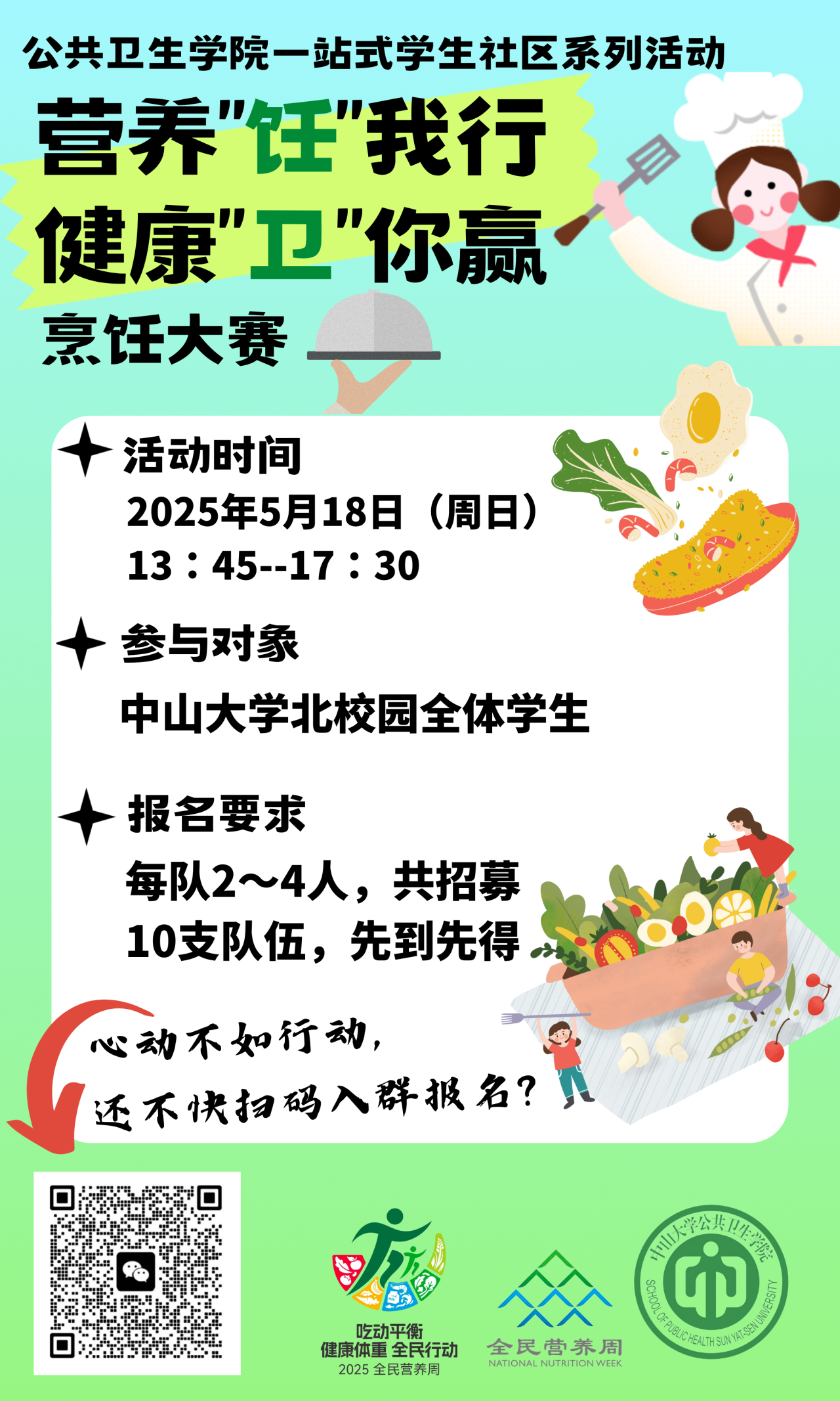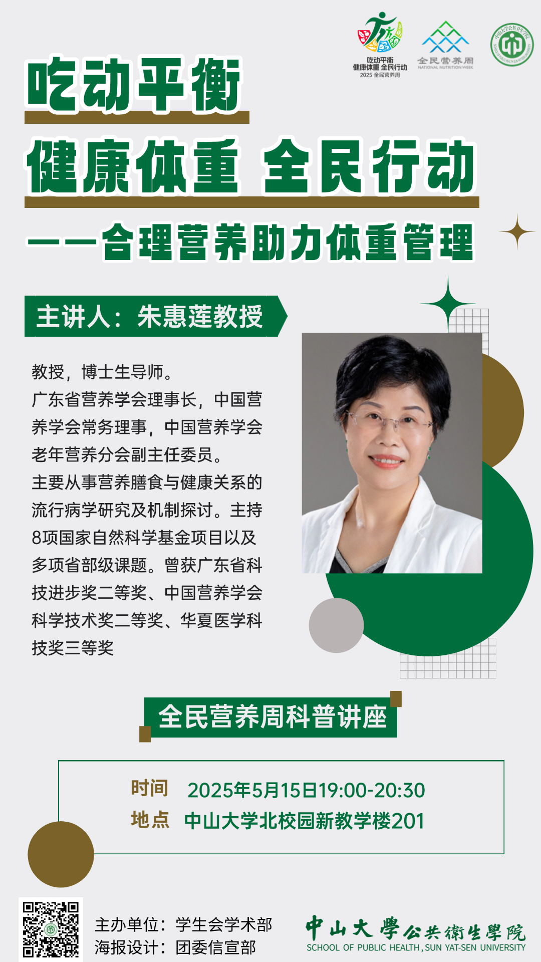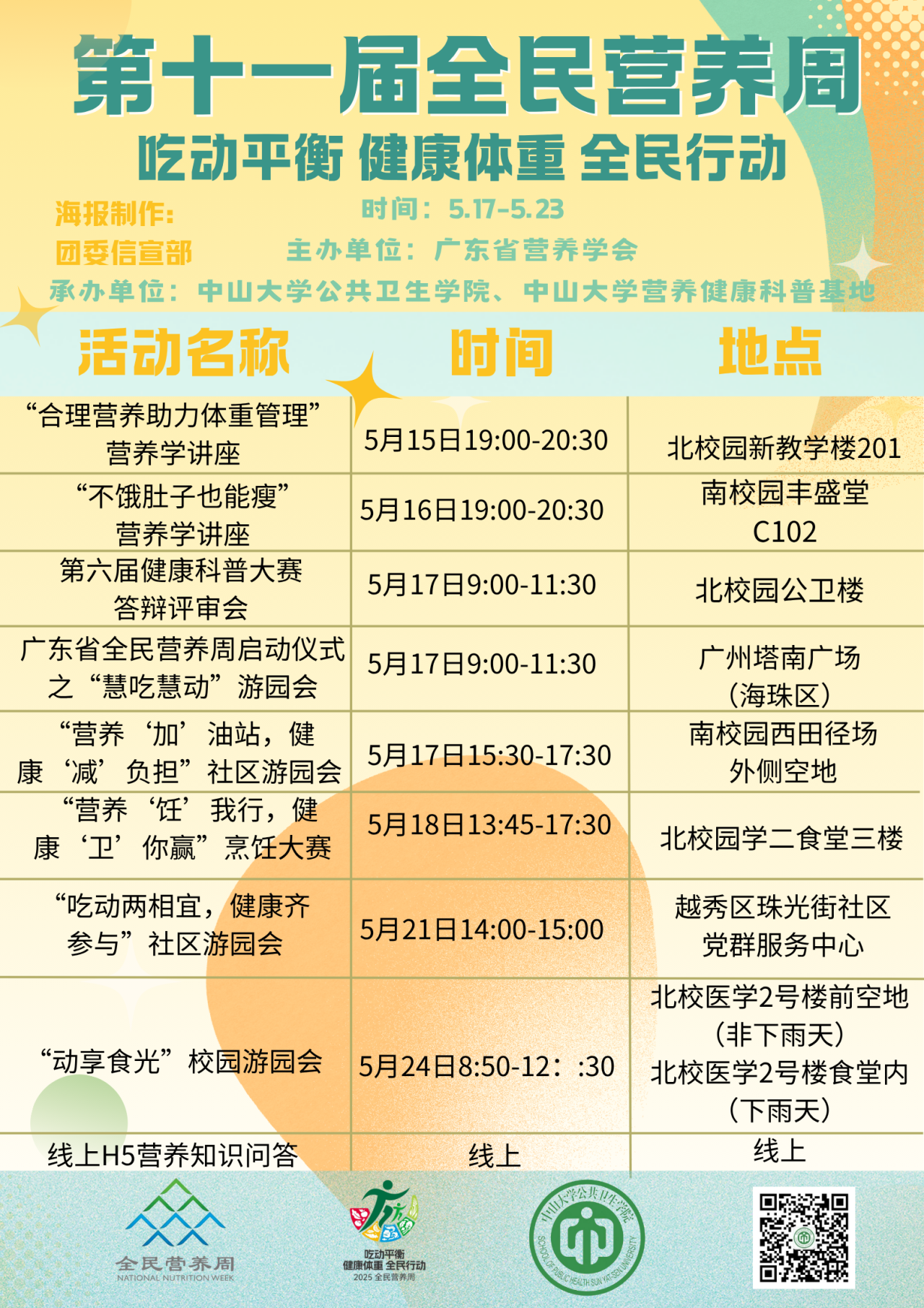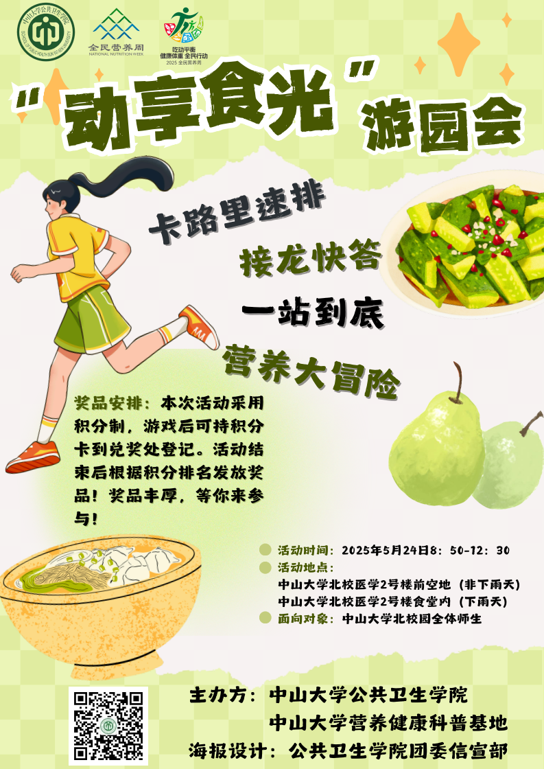 营养与食品卫生学系研究生党支部将参与此次广东省全民营养周启动仪式,通过摆摊宣传和组织趣味游戏的方式,以“吃动平衡 健康体重 全民行动”为主题,向社区居民普及健康饮食与适量运动的核心理念,激励他们养成积极向上的生活习惯,共同迈向健康体重的美好目标。现场共设有“猜灯谜”“膳食宝塔连连看”“热量列兵排排站”三个游戏,按最终积分排名发放一等奖6份、二等奖60份、三等奖50份。参与游戏即可获得参与奖!