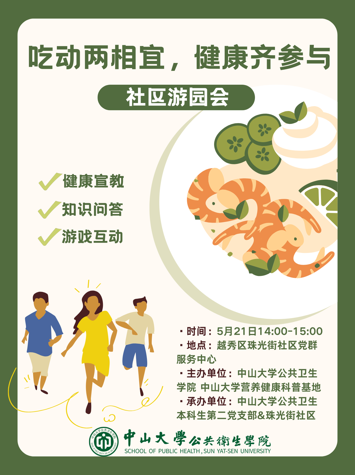 本科生第二党支部将联合珠光街社区党群服务中心,通过讲座和游园会形式进行健康宣教,帮助大家摆脱营养误区,提高对营养的认识。现场将安排营养讲座、知识问答和运动竞赛等互动游戏,让居民在轻松愉快的环境中学习健康知识,鼓励大家将健康的生活方式融入日常生活中。