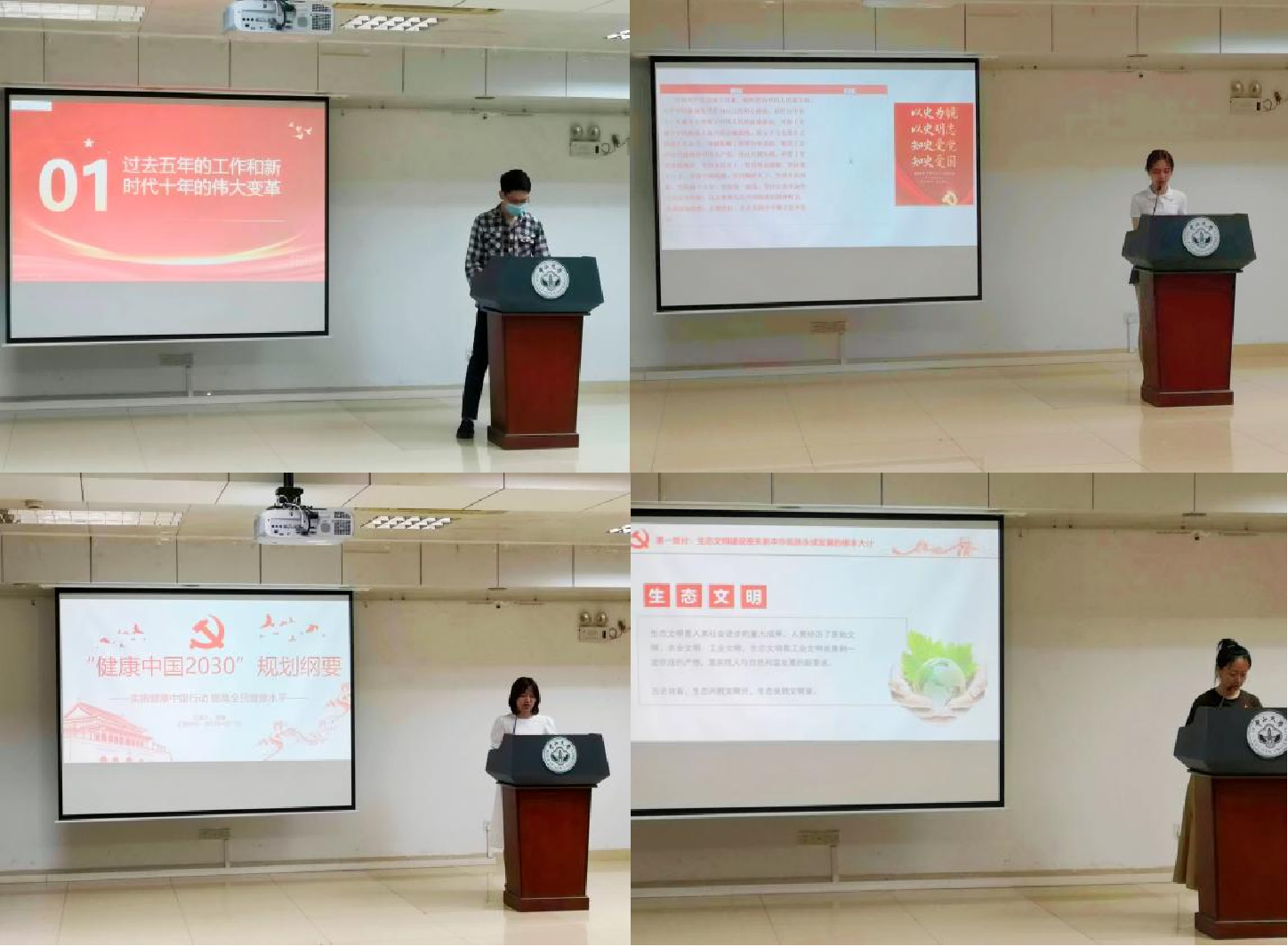 在本次理论学习中,本科生党支部支部将支部成员分为三个党小组,采取“自学+集中学习+专题研讨”的形式,以党小组为单位认真研读党的二十大报告、《习近平新时代中国特色社会主义思想专题摘编》《中国共产党章程》等系列书籍。在党员大会上,第一党小组代表陆智君从新时代的伟大变革入手,提出新时代新征程中国共产党的使命任务;第二党小组的王炫佳同学带领大家进行《中国共产党章程》新旧版对照学习;第三党小组的邹晴、杨琳和钟艳灵同学从预防医学专业角度出发,依次从健康中国行动,我国生态文明建设和共建人类命运共同体三个方面汇报了主题学习情况。