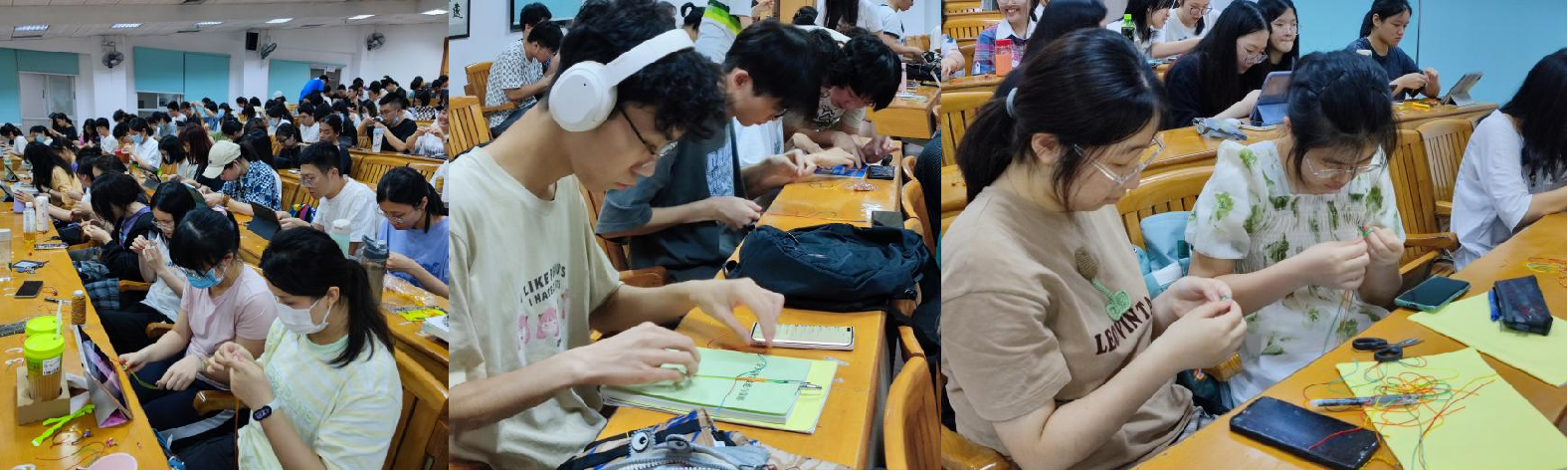 活动开始后,20、21级的同学们在欢快的音乐下沉浸于五彩绳的制作中,或跟着视频教程学习、或志愿者的指导下一起动手编织。