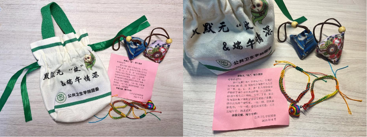 当然,我们的心意不仅仅局限于礼物的制作上,我们在礼物的包装方面也格外上心,实践部成员们将同学制作的香囊、五彩环用定制的布袋包好,并放入对老师的端午节祝福卡片。