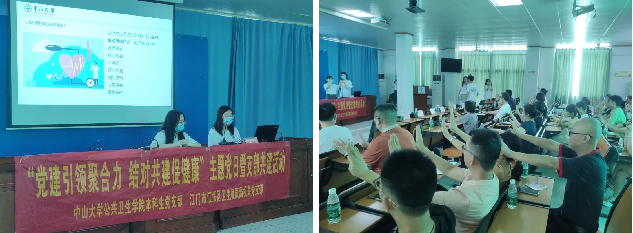 7月9日至11日,本科生党支部与江门市江海区卫生健康局机关党支部开展以“党建引领聚合力,结对共建促健康”为主题的党支部共建活动,分别在文苑社区举办了一场别开生面的健康科普游园会,在礼乐街道社区卫生服务中心开展慢性病防控宣讲。学院“百千万工程”突击队员和区卫生健康局党员干部通过互动游戏、义诊答疑、知识讲座等多种形式开展“我在家乡做科普”活动,普及约500余名群众,现场气氛浓厚,反响热烈,达到寓教于乐、学以致用的科普效果。双方通过党支部结对共建,组建“卫”来科普实践团走进江海,为江门市江海区基层党建工作提供指导;建立社会实践教育基地,为学生提供进基层、入社区实践的机会;开展便民健康站建设,惠及广大群众,让基本公共卫生服务做出特色、做出水平,推动江海区公共卫生事业实现新突破。
