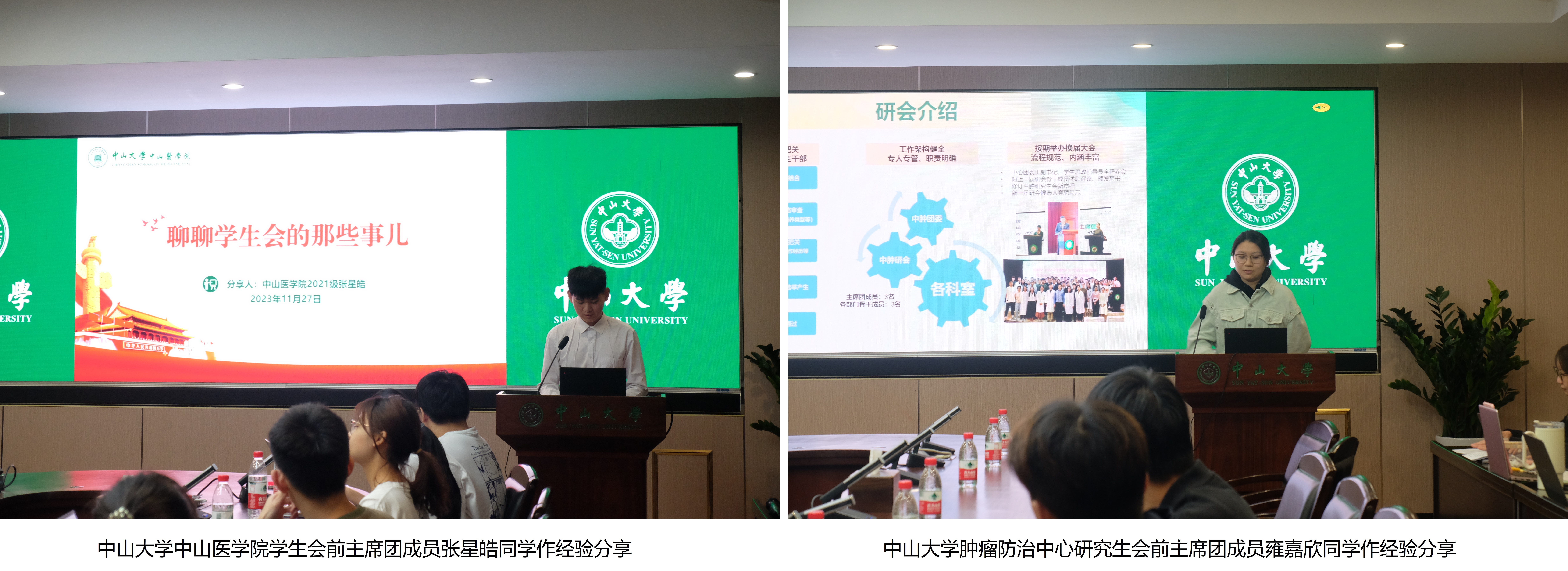 肿瘤防治中心研究生会前主席团成员雍嘉欣同学分别作作优秀学生会、优秀研究生会经验分享。他们分享了问题导向性工作思路,并与学员们共勉:始终坚持从学生中来、到学生中去,为同学们做实事、办好事。