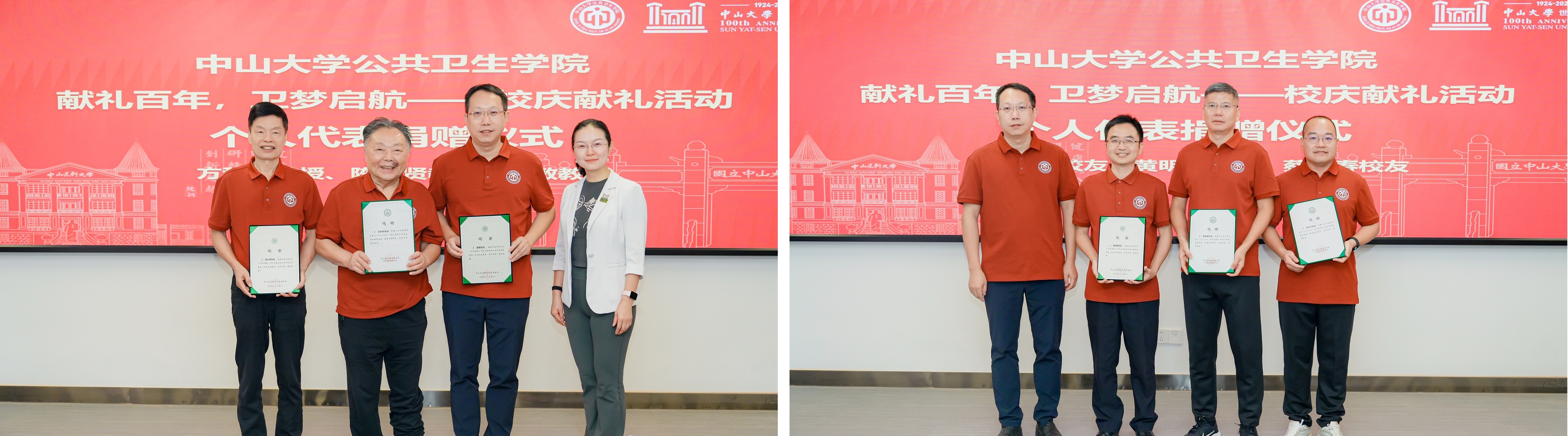 向参与捐赠的广州达安基因股份有限公司、生原微创医疗器械(南京)有限公司、广州格卢瑞生命科学有限公司等企业代表,1993级本科16班、2010级MPH硕士班等班级代表,方积乾教授等个人代表和刘汉江先生等校友代表赠送鸣谢证书。