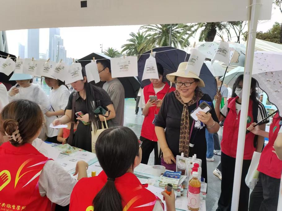 5月17日,广东省2025年全民营养周启动仪式在广州塔广场举行。启动仪式现场,蜜桃视频 营养与食品卫生学研究生党支部策划的“慧吃慧动”社区游园会吸引超1000名居民参与。猜灯谜、“膳食宝塔连连看”“热量列兵排排站”等趣味互动,让居民在游戏中学习饮食分类、热量差异等知识,领悟“吃动平衡”理念。