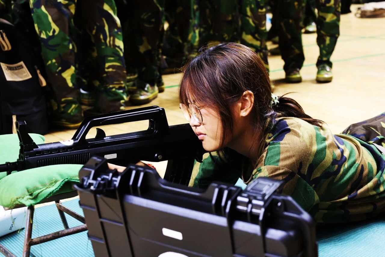 在新体育馆射击训练现场,随着教官讲解完射击动作与瞄准技巧,同学们依次持枪就位。枪口对准靶心,呼吸与扣扳机的节奏精准配合,现场只闻整齐的枪械操作声。同学们以昂扬姿态展现了公卫学子的坚毅风采。