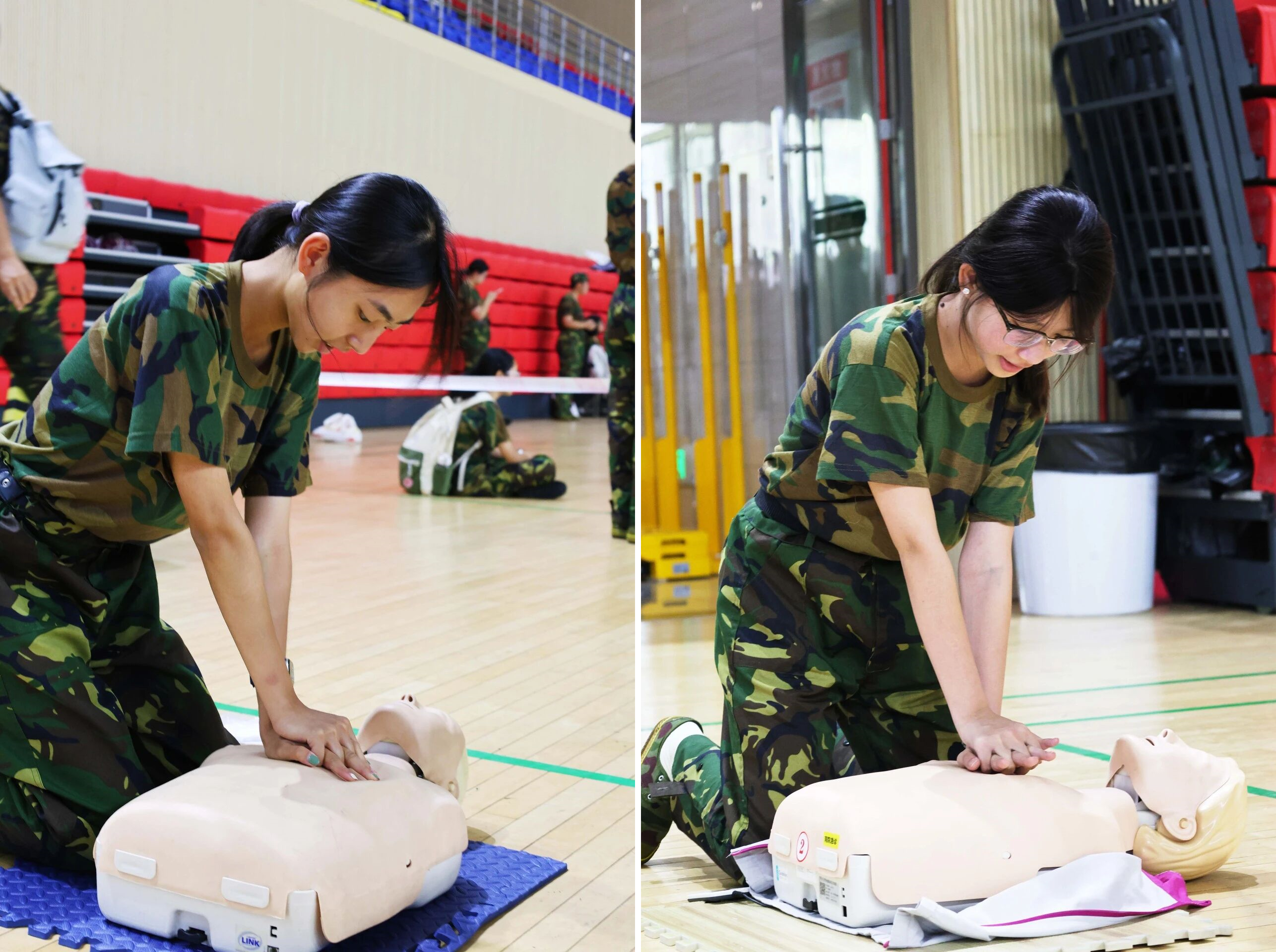 在学校体育馆,心肺复苏培训紧张开展。老师逐项讲解胸外按压深度、人工呼吸频率,同学们反复练习、默契配合,将“健康守护者”的责任融入每一次按压与通气。