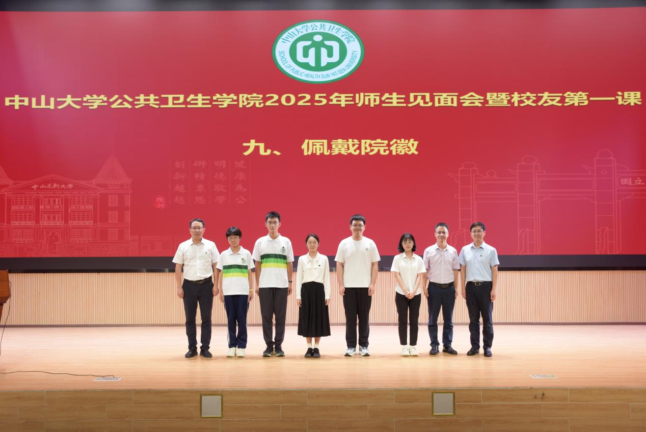 佩戴院徽,开启求学新篇章。院长夏敏、副院长王庆为新生代表佩戴院徽,全体与会新生起立同步自行佩戴。这象征着新生们从此成为“中大公卫人”,将肩负着公卫人的使命和责任。院徽不仅象征着蜜桃视频 “健康为公”的精神使命,更寄托着师长以及前辈的深切期望,希望同学们成为“具有国际视野、心怀民众健康、高素质的公共卫生与预防医学领军人才”。