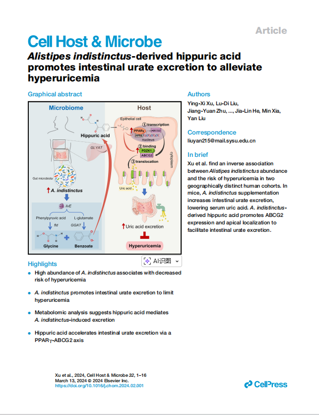 在导师柳雁教授的指导下,许潆兮聚焦我国重大公共卫生问题,将人民的健康生活作为科研工作的落脚点,把改善民生作为科研工作的重要方向,基于团队建立的华南自然人群队列,针对华南地区高尿酸血症高发这一公共卫生问题开展系列研究。经过三年的攻坚克难,她首次揭示了肠道共生菌通过促进肠道尿酸盐排泄降低高尿酸血症风险的作用机制,为高尿酸血症早期防治提供了更安全、更高效的早期防治手段。她以共一第一作者,在Cell Host & Microbe(高被引论文)和Food Science and Human Wellness发表相关研究成果,并获批国家发明专利1项、公开美国专利1项,为疾病的早期筛查与精准干预提供了实质性技术支撑。其成果受到国内外同行高度评价,获全额资助受邀在法国巴黎举行的第23届国际营养大会进行口头汇报,让国际学术界听到了清晰而有力的“中大声音”,为推动健康中国战略、实现全民健康交出了一份答卷。
